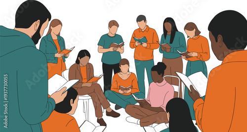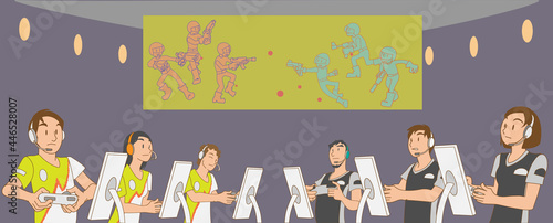 People watching movie at cinema theater and sitting in chairs in auditorium. Concept vector hand drawn illustration. Couple, family with kids, man and women watch film and eat popcorn.