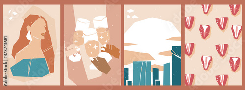 People with sick symptoms at home and on a street, vector posters set. Cold and flu season. Woman in bed having cold, fever, running nose, coughing and taking medicine drugs. Covid crowd.