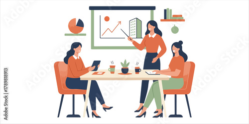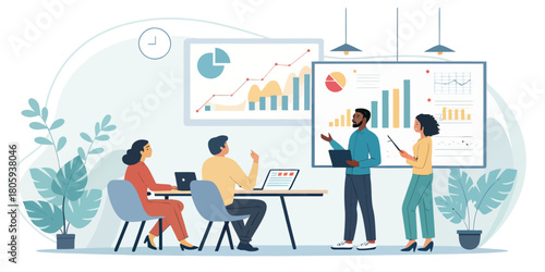 People work in office vector illustration. Team of employees work in business interior. Modern office workplace concept in flat style. Agile scrum board with tasks.
