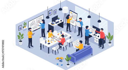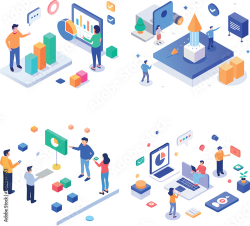 People working remotely from home, flat vector isometric illustration. Home office. Freelance. Business group meeting, webinar, video conference.