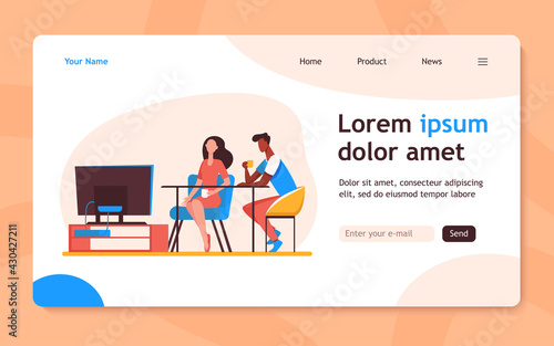 Pet grooming landing page website template. Vector flat illustration of pet groomers providing dog grooming services. Dog haircut. Barber pet salon.