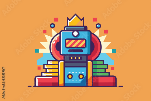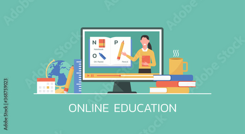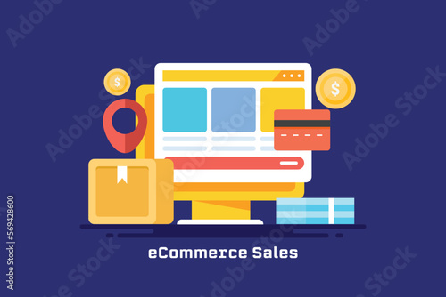 Pet shop cashbox vector illustration. Young saleswoman standing at counter, food for birds, dogs and cats on shelves, pets supplies, flat style design elements.