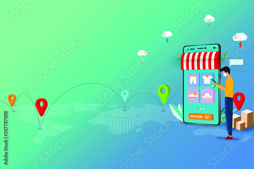 Pet shop vector flat style design illustration. Parrot in cage, dog food, bone, mouse toy, vet stethoscope, pill bottle. Animal supplies and pet accessories composition for web banner, website page.