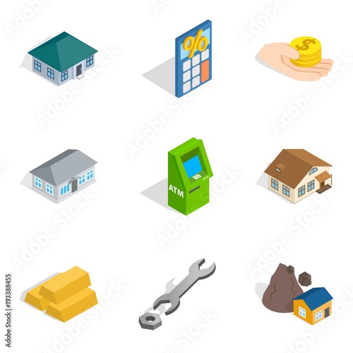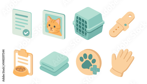 Pet store icon set. Vector flat isometric illustration of pet food supplies and treats, toys, collar, bedding accessories, kennels, pet carries, grooming kits, cat litter box, bowl and scratching post