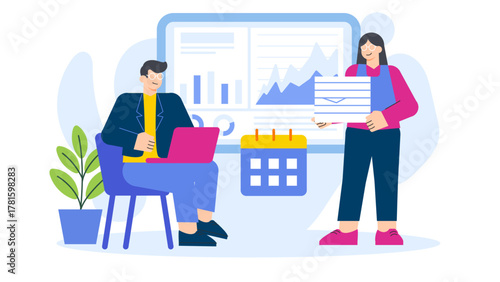 Pet vaccination web banner template, vector illustration. Huge calendar, microscope, pills bottle, syringe and tiny characters vet, dog owner. Veterinary pet care concept for web banner, website page