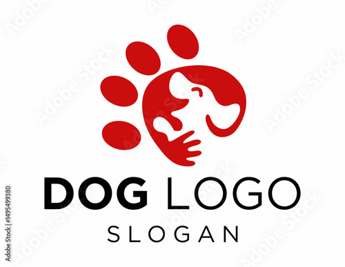 Pets shop logo design template. Vector paper art illustration of red paw print and dog, cat and parrot silhouettes in it.
