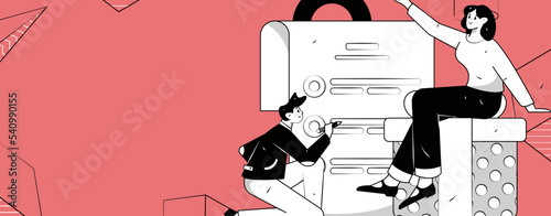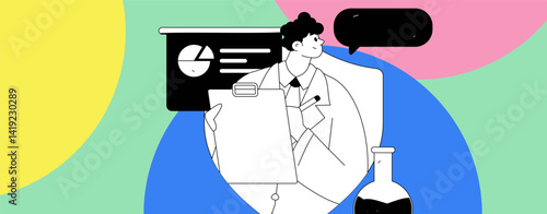 Vector illustration of big microscope and pharmacists, scientists working at lab. Pharmacological business, pharmacy laboratory equipment, pharmaceutical industry concept for web banner, website page.