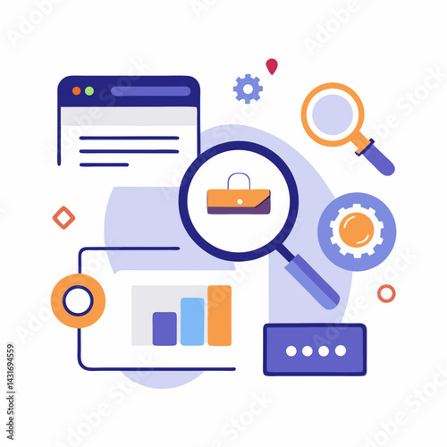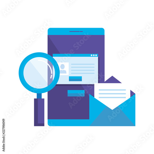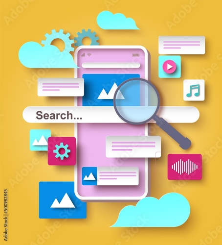 Phone search engine vector. Mobile web browser design. Internet website on smartphone. Information review, research and analysis online