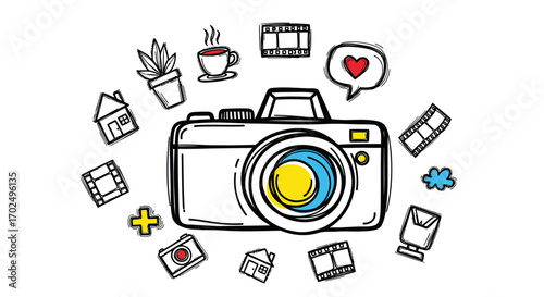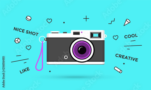 Photo competition vector website template, web page and landing page design for website and mobile site development. Photography contest winner micro male character with cup standing on huge camera.