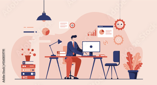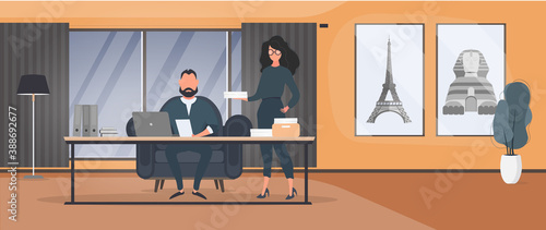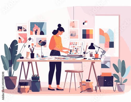 Photographer shooting young girl and cute pet dog with professional camera in studio, flat vector illustration. Photographer profession. Photoshoot.