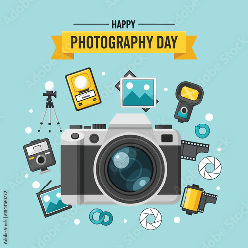 Photographers service vector flat style design illustration. Computer, camera, digital camera, photographic films, memory cards. Professional photography concept for web banner, website page etc.