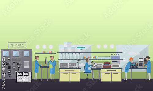 Physics concept vector illustration in flat style. laboratory interior, physicists carrying out experiments using lab glassware and equipment.