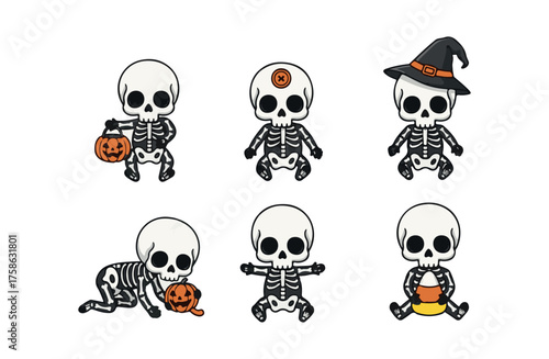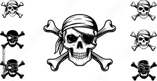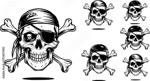 Pirate skull set, vector hand drawn illustration isolated on white background. Human skull with crossed swords and bones, wearing pirate captain hat, bandana, eyepatch. Vintage tattoo t-shirt graphics