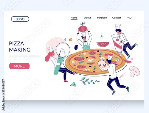 Pizza making vector website template, web page and landing page design for website and mobile site development. Pizzeria restaurant chefs making huge italian pizza with salami, mushrooms and tomatoes.
