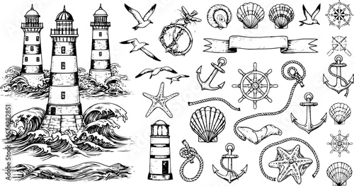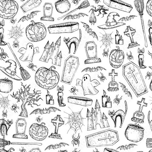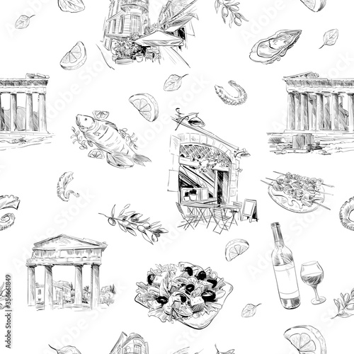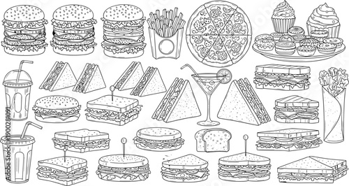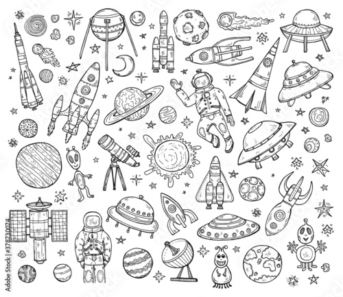 Pizza set. Vector ink hand drawn illustration isolated on white background. Pizzaiolo, pizza ingredients and kitchen utensils and oven.