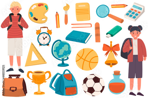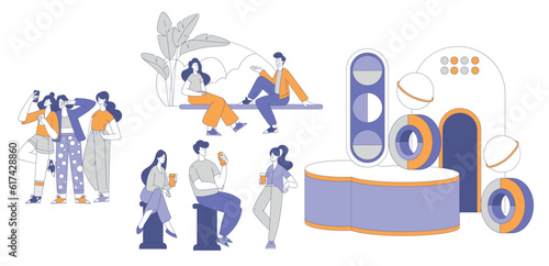 Planetarium, space museum scene set, flat vector illustration. People looking at night sky, solar system planets, stars, celestial bodies through telescope, listening to guide. Astronomy education.