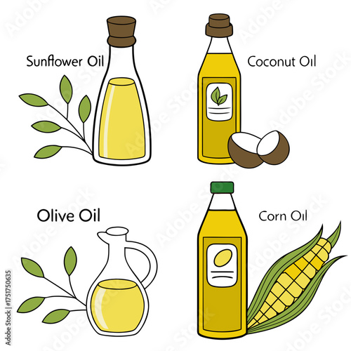 Different types of vegetable oil bottle set. Vector realistic illustration of soy, olive, sunflower and mustard oil glass bottles. Natural cooking ingredients.