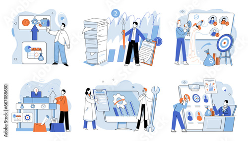 Plastic window installation vector scene set. Home repair service illustration. Handyman worker fixing, measuring, delivering pvc equipment for house renovation