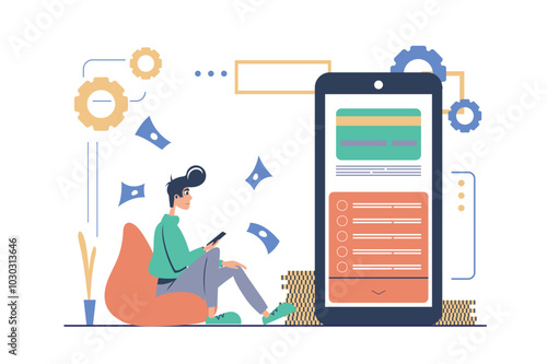 Podcast vector flat style design illustration. Big smartphone and tiny people listening to podcast audio programmes on mobile phone, laptop computer, portable media player.