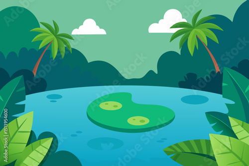 Podium on tropical summer papercut vector background. Circle stage on seaside or river beach craft origami art mockup template. Advertising poster or banner design