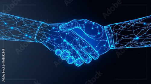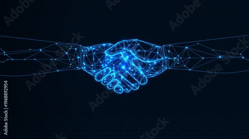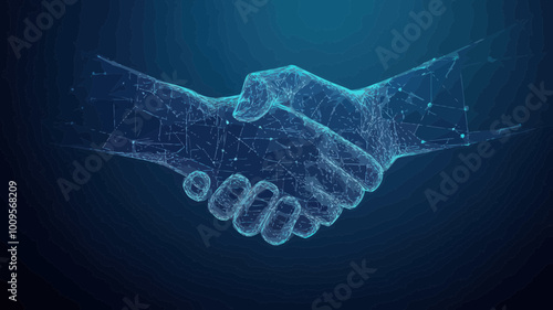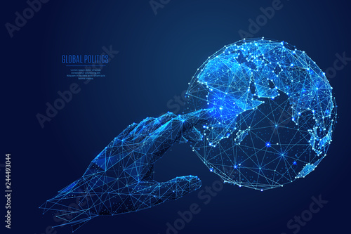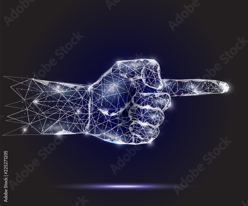 Vector polygonal art style pointing hand gesture. Low poly wireframe mesh with scattered particles and light effects on dark blue background. Poster banner design template.
