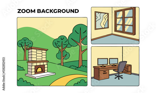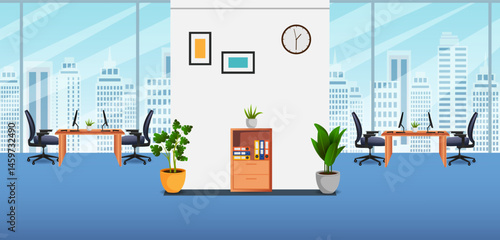 Vector illustration of police station interior and staff, parking lot and cycle stand. Flat style design.
