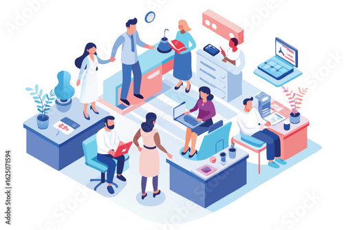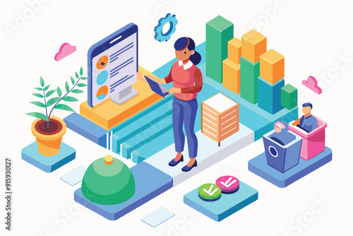 Political election and debates infographic isometric elements. Presidential candidates, tv studio, camera operator, voting cabin, poll results charts.