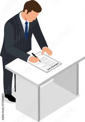 Politician at podium vector. Isometric man speaker, election leader candidate or conference presenter performing with debate speech icon on white background