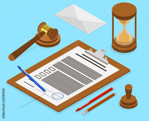 Pollution prevention law vector concept illustration. Legal symbols Law book with industrial factory chimneys, scales of justice, judge gavel. Isometric composition for web banner, website page, etc.