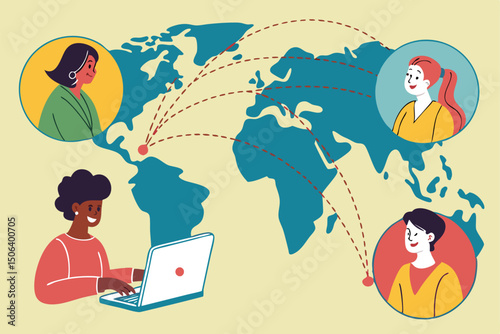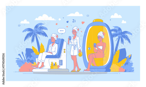 Pool typography vector banner template. Happy girls in swimsuits sunbathing, relaxing on inflatable swan swimming ring, reading book, using laptop, playing ball etc. in swimming pool. Summer vacation.