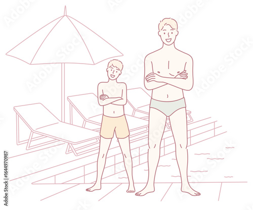 Happy loving couple wearing swimsuit portrait. Young man and woman sunbathing on vacation at tropical resort vector illustration. Boyfriend and girlfriend hugging