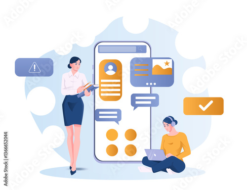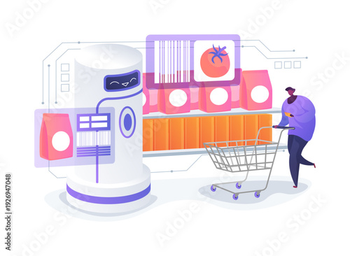 Huge pos terminal with receipt, micro male and female characters making purchases using credit card, vector flat style design illustration. Contactless payment, complete transaction, payment terminal.