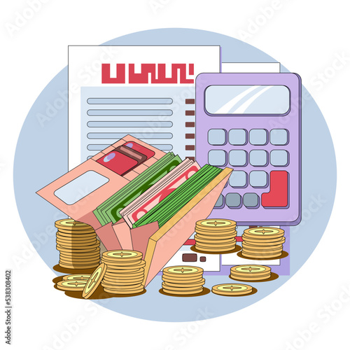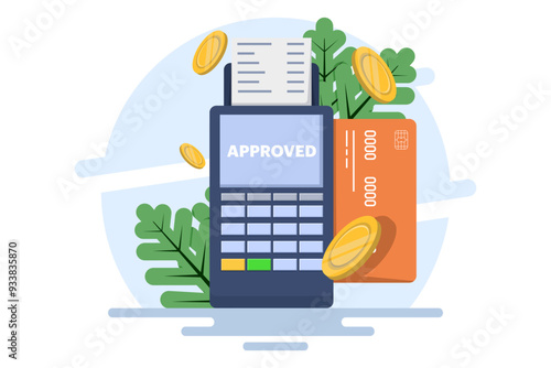 Huge payment pos terminal machine with credit card and receipt, micro characters, vector flat style design illustration. Contactless payment, money transfer concept for web banner, website page etc.