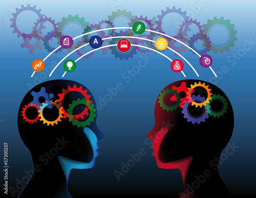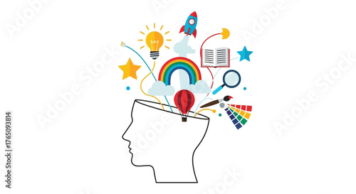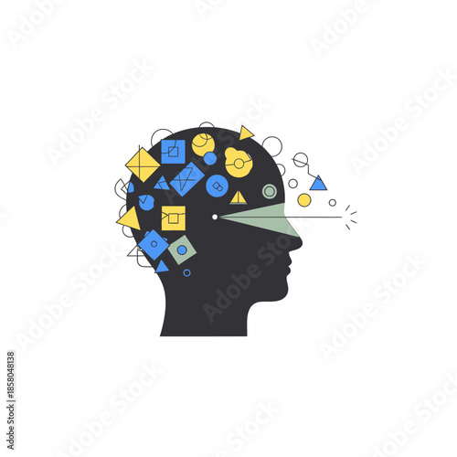 Positive or negative thinking vector illustration. Human head in profile with rainy cloud and sunny rainbow weather inside head. Mental health, mindfulness and stress management paper cut art