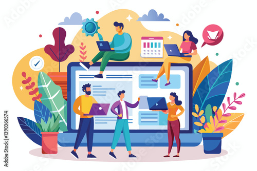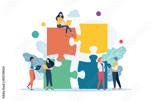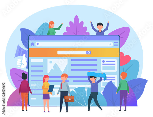 Vector illustration of tiny people carrying big envelopes, postman running with postbag. Post office, postal service, correspondence delivery concept for web banner, website page etc.