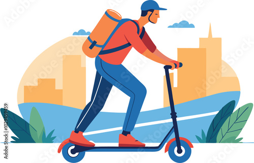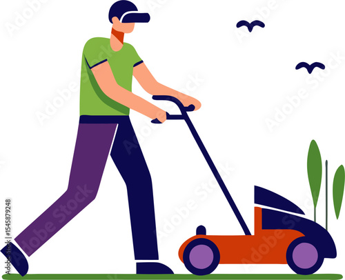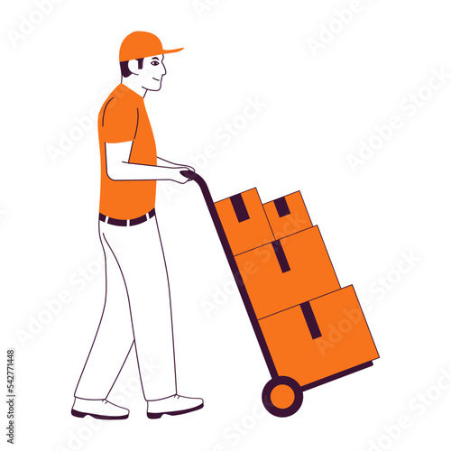 Young man pushing cart with parcels, vector flat illustration isolated on white background. Postal mail delivery service, receiving and sending parcels concept for web banner, website page etc.