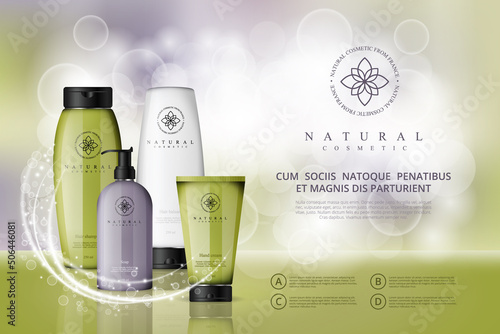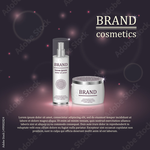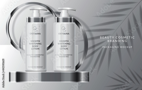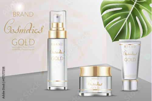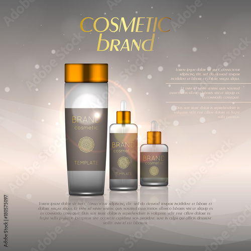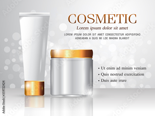 Premium cosmetic products ad. Vector 3d illustration. Skin care brand bottle template design. Face and body make up cream and lotion.