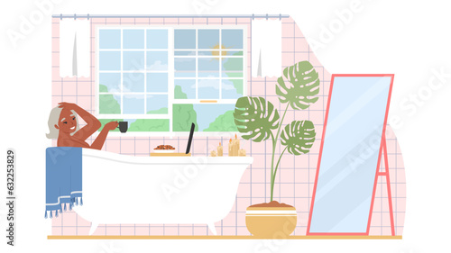 Pretty young woman character relaxing eating, drinking wine, watching video on laptop computer while taking bath at home vector illustration