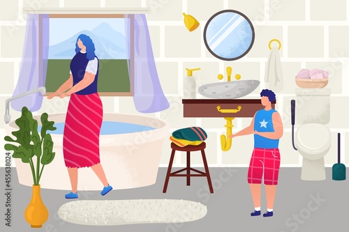 Pretty young woman with perfect body taking shower in home bathroom vector illustration. Hygiene cleanliness and beauty procedure