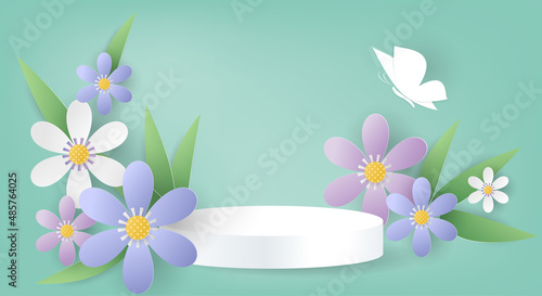 Round display podium mockup, paper cut spring flowers and leaves, vector illustration. Spring floral background, pedestal, stage for beauty and cosmetic product ads.