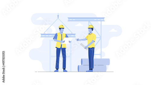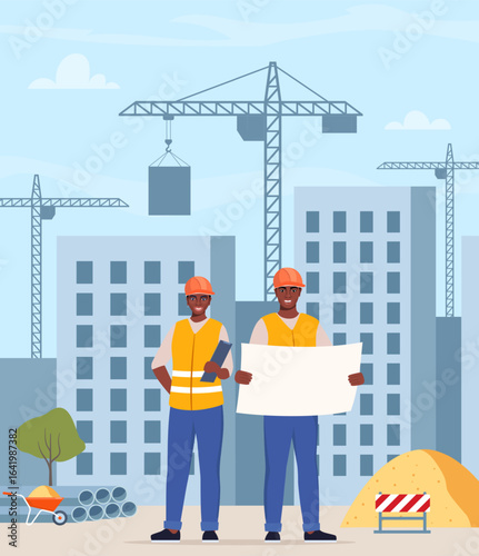Professional construction engineers and architects in helmets discussing architecture project of modern city buildings, flat vector illustration. House building industry, construction development.
