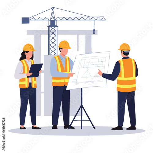 Professional construction engineers and architects in helmets discussing architecture project of modern city buildings, flat vector illustration. House building industry, construction development.