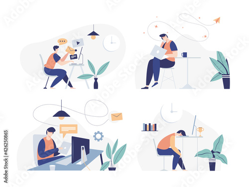 Professional dental care, vector flat illustration. Big tooth and tiny woman patient in dentist chair, doctor with toothbrush and assistant with toothpaste. Tooth healthcare, teeth whitening concept.