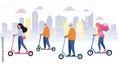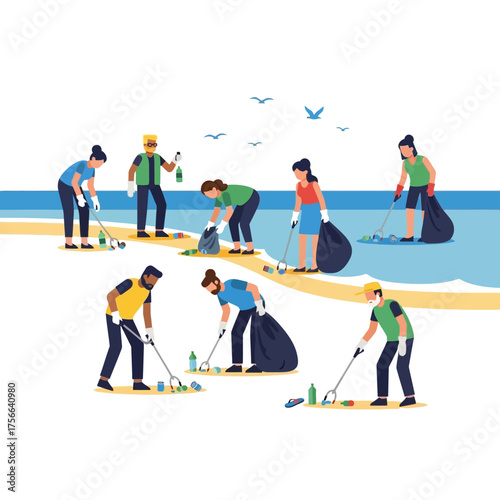 Professional home cleaning services, vector flat illustration. Male and female characters, cleaning company staff picking up trash, washing window and floor in living room.