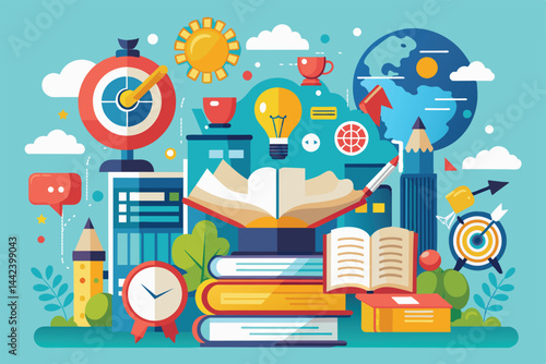 Vector flat style design illustration of desktop computer with human brain on monitor, book, globe, glasses, wallet with dollar coin, compact disc. Professional programmer concept for web banner etc.