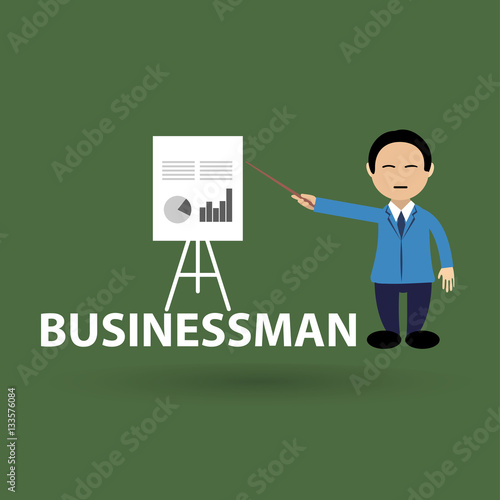 Vector illustration of businessman giving presentation. Lecturer male pointing at projection screen. Flat style design.