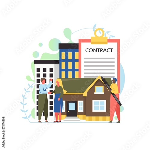 Property vector flat style design illustration. Real estate agent and customer female shaking hands. Purchase, sale or rental of house concept for web banner, website page etc.