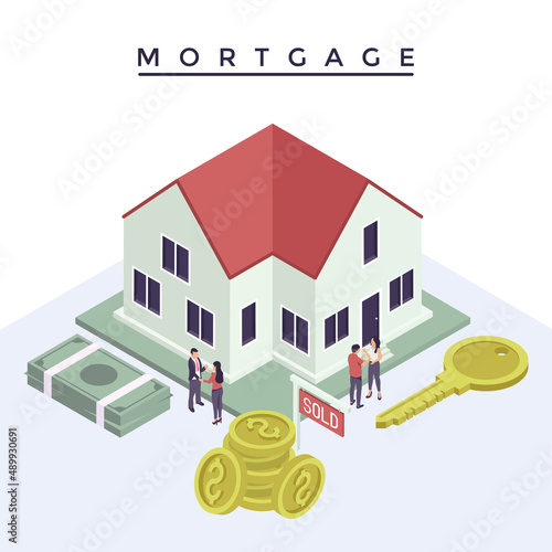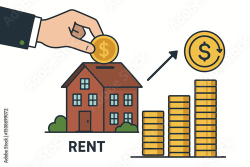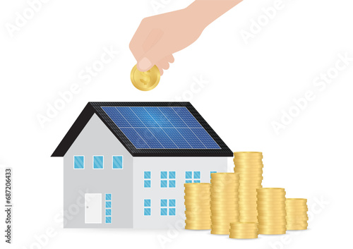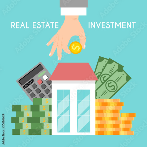 Property Investment concept. House and real estate money investment. Building placed next to coin stack. Dollar symbols and design elements.