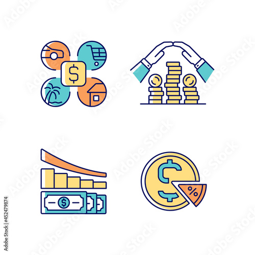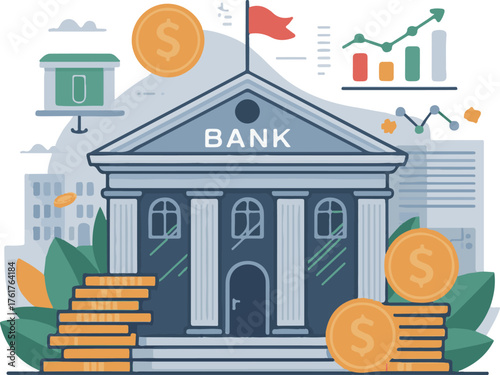 Property Investment concept. House and real estate money investment. Building placed on coin stack. Dollar symbols and design elements.