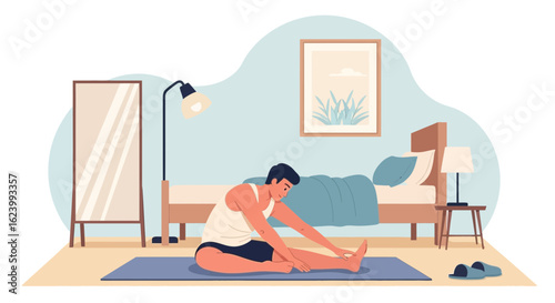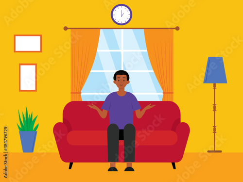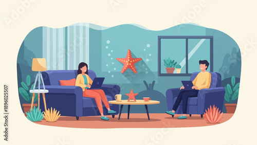 Vector illustration of doctor female sitting next to lying on couch male. Psychologist or psychiatrist listening to problems of patient. Psychotherapist flat style design.